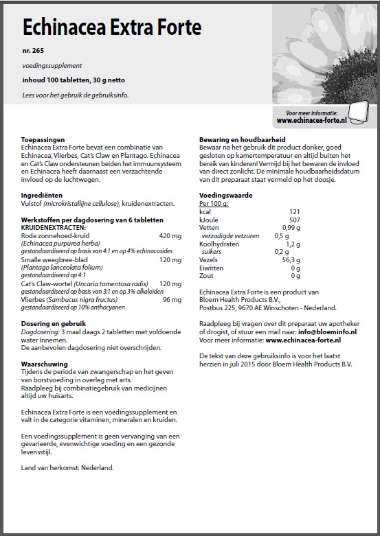 Echinacea Extra Forte bevat een combinatie van Echinacea, Vlierbes, Cat's Claw en Plantago. Echinacea en Cat's Claw ondersteunen beiden het immuunsysteem en Echinacea heeft daarnaast een goede invloed op de luchtwegen.