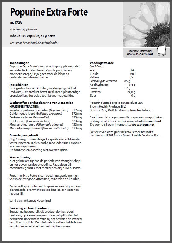 Popurine Extra Forte is een voedingssupplement dat een selectie kruiden bevat. Zwarte populier en Mannetjesereprijs zijn goed voor de blaas en ondersteunen de nierfunctie.