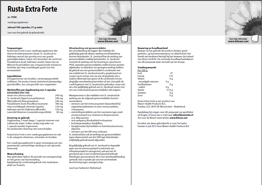 Rusta Extra Forte is een voedingssupplement dat diverse kruidenextracten bevat. St. Janskruid en Valeriaan-wortel zijn gunstig voor een goede geestelijke balans. Haver-stro bevordert de nachtrust. Passiebloem-kruid, Valeriaan-wortel, Haverstro en Wijnruit-kruid hebben een ontspannende invloed en tenslotte zijn Hop-vruchtkegels goed voor het zenuwstelsel.