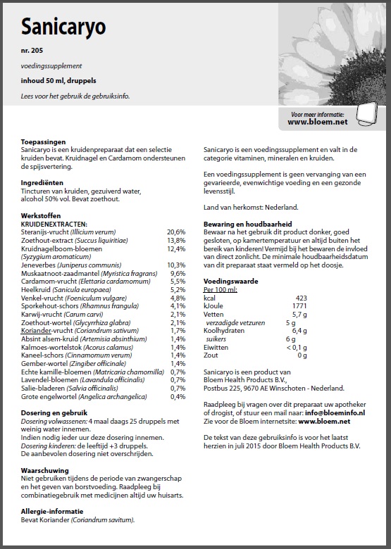 Sanicaryo is een kruidenpreparaat dat een selectie kruiden bevat. Kruidnagel en Cardamom ondersteunen de spijsvertering.