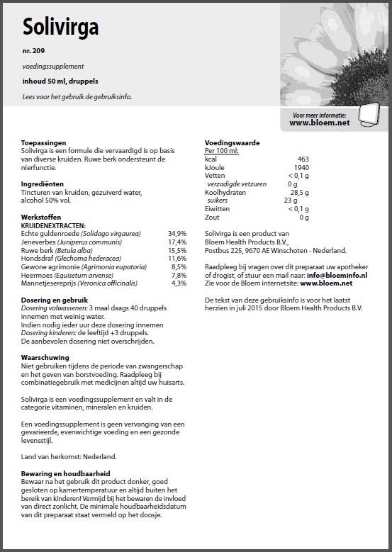Solivirga is een formule die vervaardigd is op basis van diverse kruiden. Ruwe berk ondersteunt de nierfunctie.