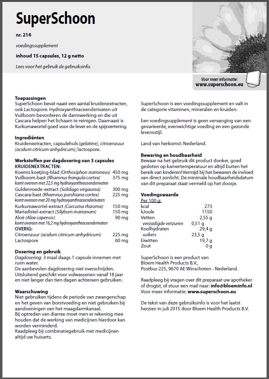 SuperSchoon bevat naast een aantal kruidenextracten, ook Lactospore. Hydroxyanthraceenderivaten uit Vuilboom bevorderen de darmwerking en die uit Cascara helpen het lichaam te reinigen. Daarnaast is Kurkumawortel goed voor de lever en de spijsvertering.