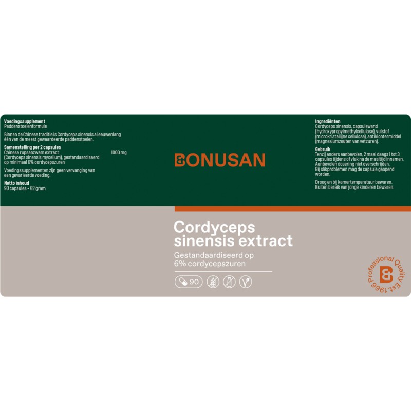 Bonusan Cordyceps sinensis extract is een puur plantaardig supplement. In tegenstelling tot de wilde variant van cordyceps, bevat het geen dierlijke ingrediënten, maar wel alle natuurlijke stoffen die cordyceps uniek maken.