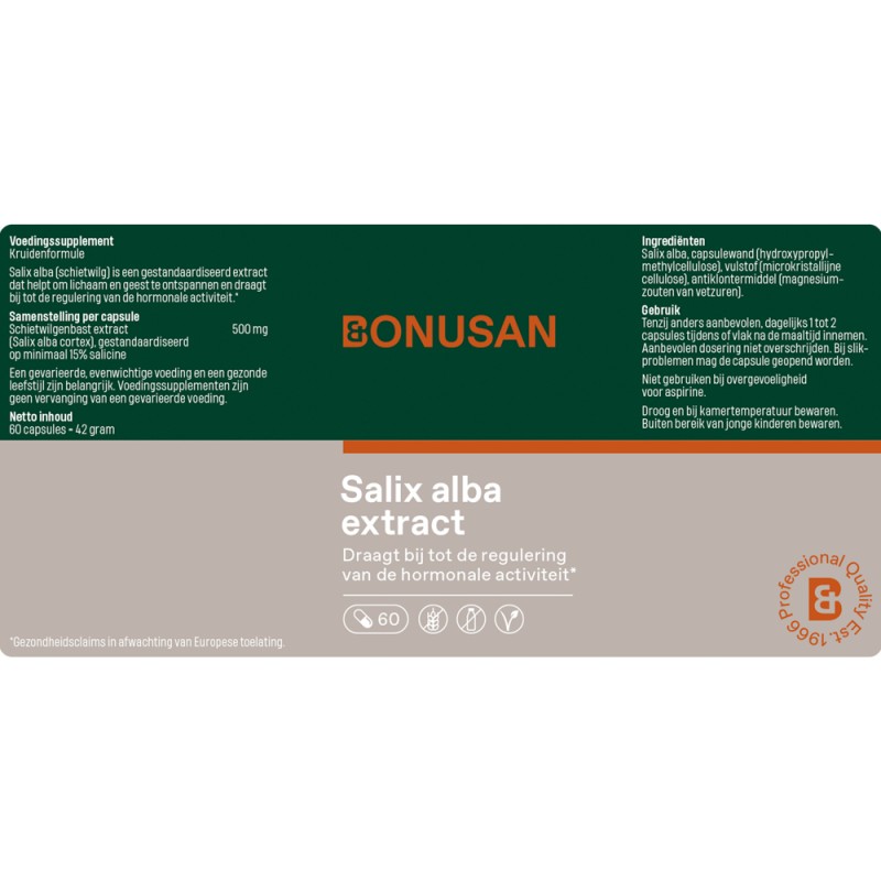 De bast van Salix alba (schietwilg) is rijk aan salicine, een stof die in het lichaam wordt omgezet in salicylzuur. Salix alba extract is gestandaardiseerd op 15% salicine.