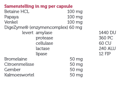 Betaline HCL, papaya, foeniculum vulgare mill., bromelaine, melissa officinalis, zingiber officinale, acorus calamus L.,