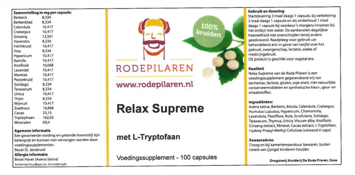 Relax Supreme van de Rode Pilaren is een voedingssupplement gegarandeerd vrij van sacharose, lactose, gluten, soja eiwit, niet natuurlijke conserveermiddelen en synthetische kleur-, geur- en smaakstoffen.
