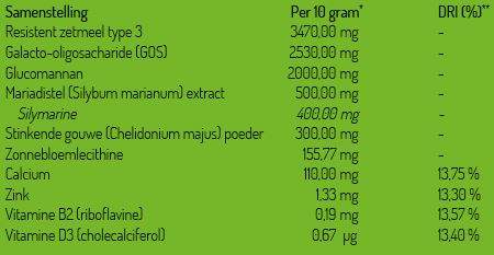 ** Percentage van de dagelijkse referentie inname (DRI) bij 10 gram. Bij - geen DRI vastgesteld.