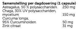 Astragalus membranaceaus, Chaga (Inonotus obliguss), Curcuma longa, Zink citraat, hydroxy-propyc-methylcellulose (celwand-vega capsule)