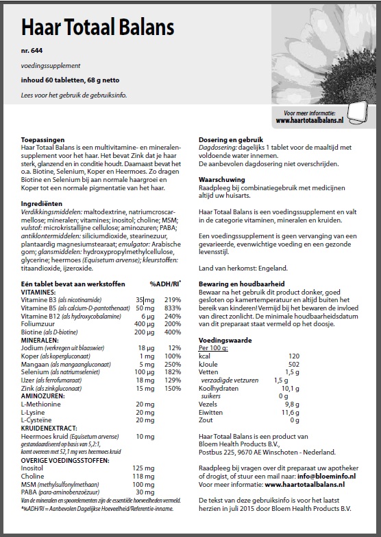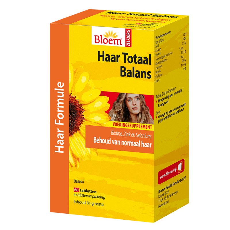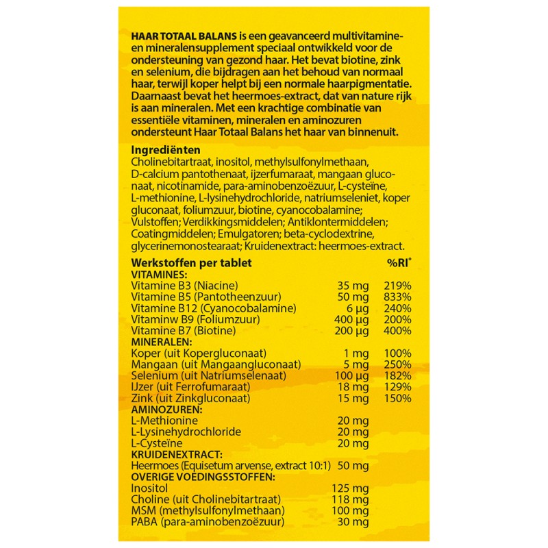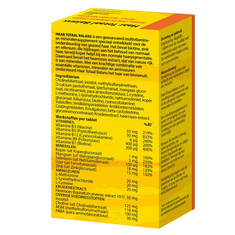HAAR TOTAAL BALANS is een geavanceerd multivitamine- en mineralensupplement speciaal ontwikkeld voor de ondersteuning van gezond haar. Het bevat biotine, zink en selenium, die bijdragen aan het behoud van normaal haar, terwijl koper helpt bij een normale haarpigmentatie. Daarnaast bevat het heermoes-extract, dat van nature rijk is aan mineralen. Met een krachtige combinatie van essentiële vitaminen, mineralen en aminozuren ondersteunt Haar Totaal Balans het haar van binnenuit.