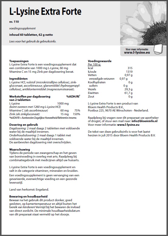 L-Lysine Extra Forte is een voedingssupplement dat onder andere 1000 mg L-Lysine per dagdosering van 2 tabletten bevat.