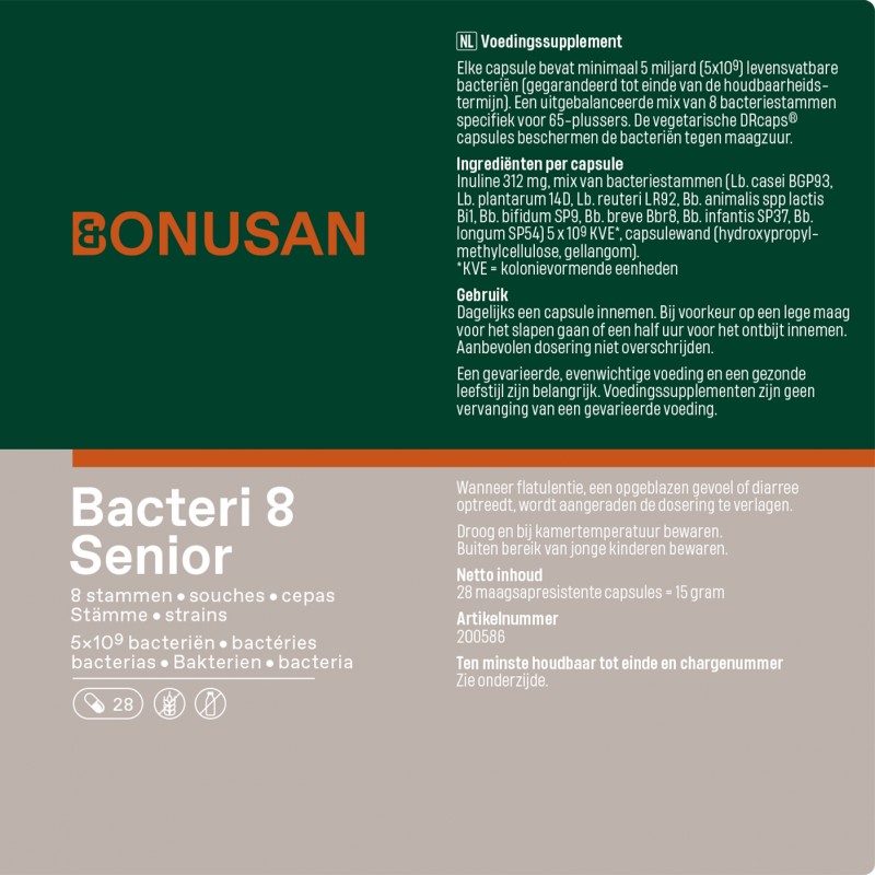 Bonusan Bacteri 8 Senior biedt een uitgebalanceerde mix van 8 bacteriestammen, speciaal geformuleerd voor de ouder wordende mens. Het is bekend dat naarmate de leeftijd vordert de hoeveelheid en diversiteit aan bacteriën in het microbioom afneemt. De bacteriestammen in dit product zijn afgestemd op de bacteriën die van nature voorkomen in het oudere microbioom.