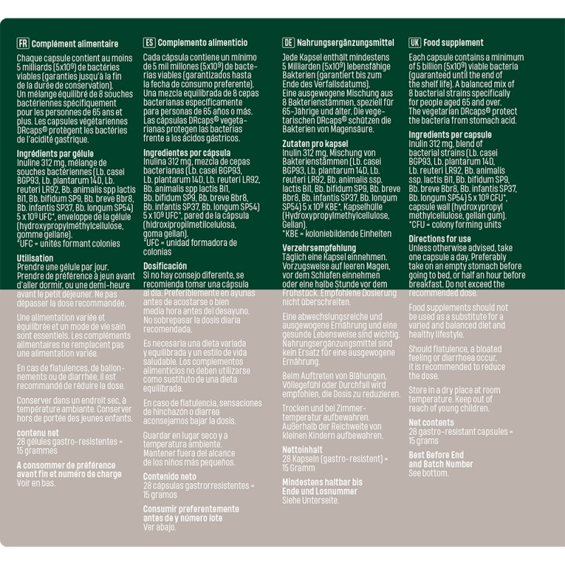 - Specifiek voor 65-plussers, mix van 8 bacteriestammen