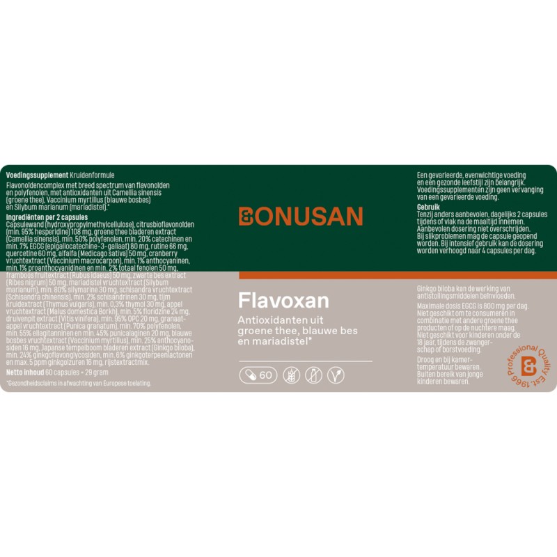 Flavoxan biedt een breed spectrum aan flavonoïden, stoffen die van nature voorkomen in planten, kruiden en fruit. Flavoxan biedt zo een mooie aanvulling op een gezond en gevarieerd voedingspatroon.
