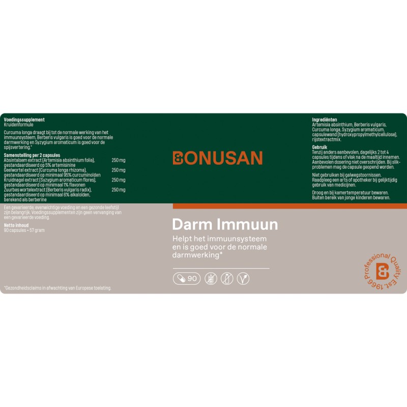 Bonusan Darm Immuun bevat vier gestandaardiseerde kruidenextracten. Curcuma draagt bij tot de normale werking van het immuunsysteem*. Curcuma, zuurbes en kruidnagel zijn goed voor de spijsvertering.*