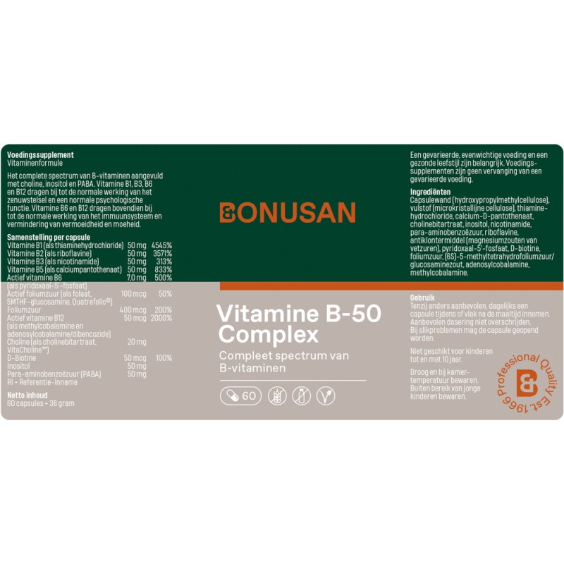 Vitamine B-50 complex bevat het complete spectrum van B-vitaminen. Daarnaast bevat het inositol, PABA en choline.