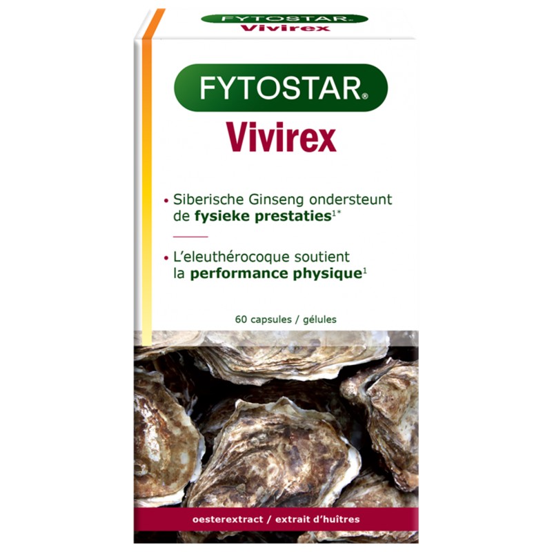 Fytostar Vivirex is een complete libidoformule voor de man. Het bevat een zuiver oesterextract in combinatie met hooggedoseerde extracten: Lavas, voor een intense vitaliteit, Eleutherococcus, dat de fysieke prestatie bevordert en Damiaanblad dat de seksuele lust verhoogt*. De formule is compleet gemaakt met vitamine B12, zink en selenium. Vitamine B12 draagt bij tot vermindering van vermoeidheid, zink tot het behoud van een gezond testosterongehalte in het bloed en selenium tot het behoud van een gezonde zaadproductie. *evaluatie gezondheidsclaims is lopende