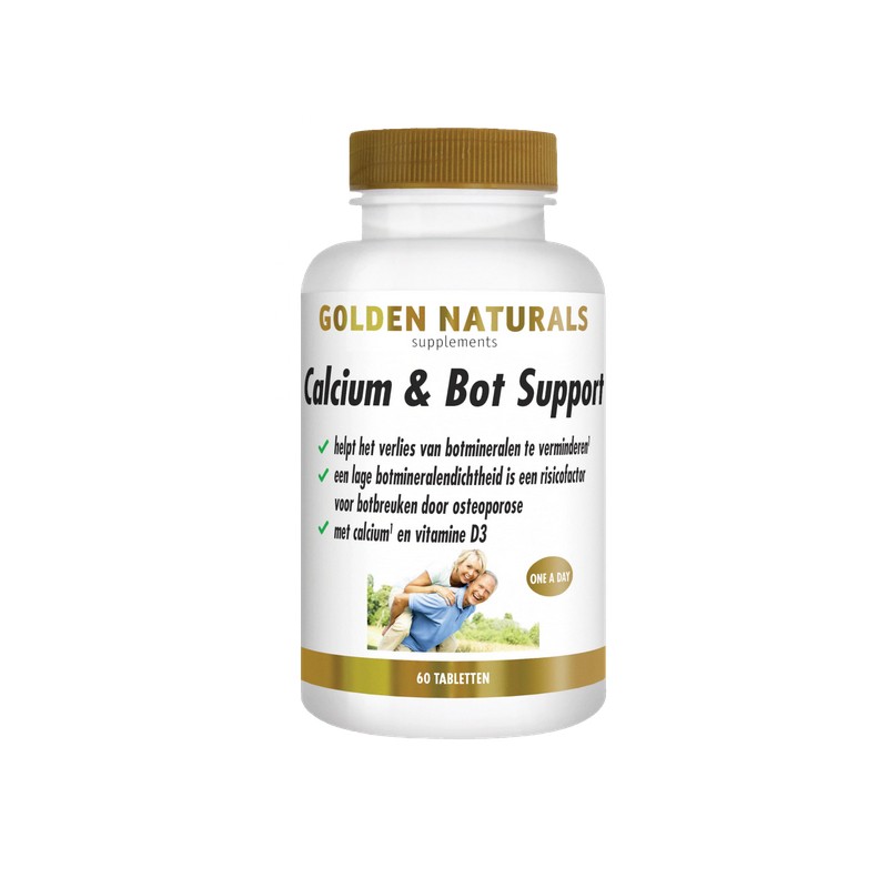 Voor extra ondersteuning is er Golden Naturals Calcium & Bot Support. Een samenstelling van onder meer calcium, magnesium, zink, vitamine C en vitamine D3.