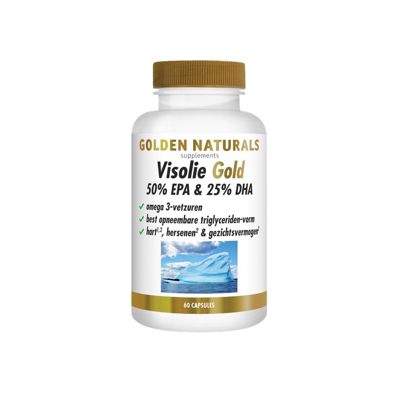 Vette vis is een rijke bron van omega-3 vetzuren EPA en DHA. Golden Naturals Visolie capsules bevatten een zuivere, kwalitatieve visolie afkomstig van ansjovis uit de noordelijke Stille Oceaan die duurzaam en onder gecontroleerde omstandigheden is gevangen. Golden Naturals Visolie EPA 50% / DHA 25% is rijk aan omega-3 vetzuren met een hoge dosering EPA en DHA. Daarnaast bevat het vitamine E. DHA en EPA hebben een gunstige invloed op het hart en DHA is daarnaast goed voor het gezichtsvermogen en de hersenen. Deze gunstige effecten worden verkregen bij een dagelijkse inname van 250 mg EPA en DHA.
