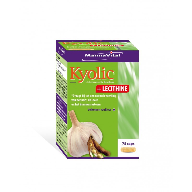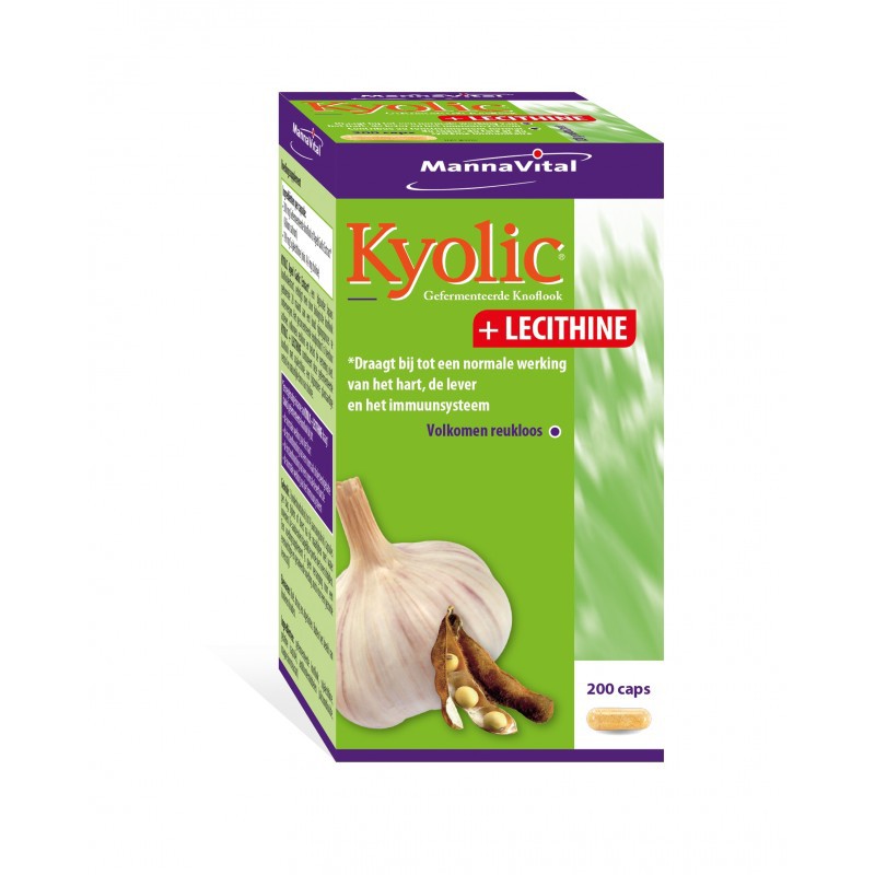 Kyolic + Lecithine is de werkzame combinatie van gefermenteerde knoflook en sojalecithine. De brede gezondheidsbevorderende werking van KYOLIC op het hart en bloedvaten, cholesterolgehalte, leverfunctie en immuunsysteem wordt hierbij gekoppeld aan de gunstige werking van de bijzondere vetstof LECITHINE, dat door zijn gehalte aan choline bijdraagt tot een normale stofwisseling van vetten en het in standhouden van een normale leverfunctie.