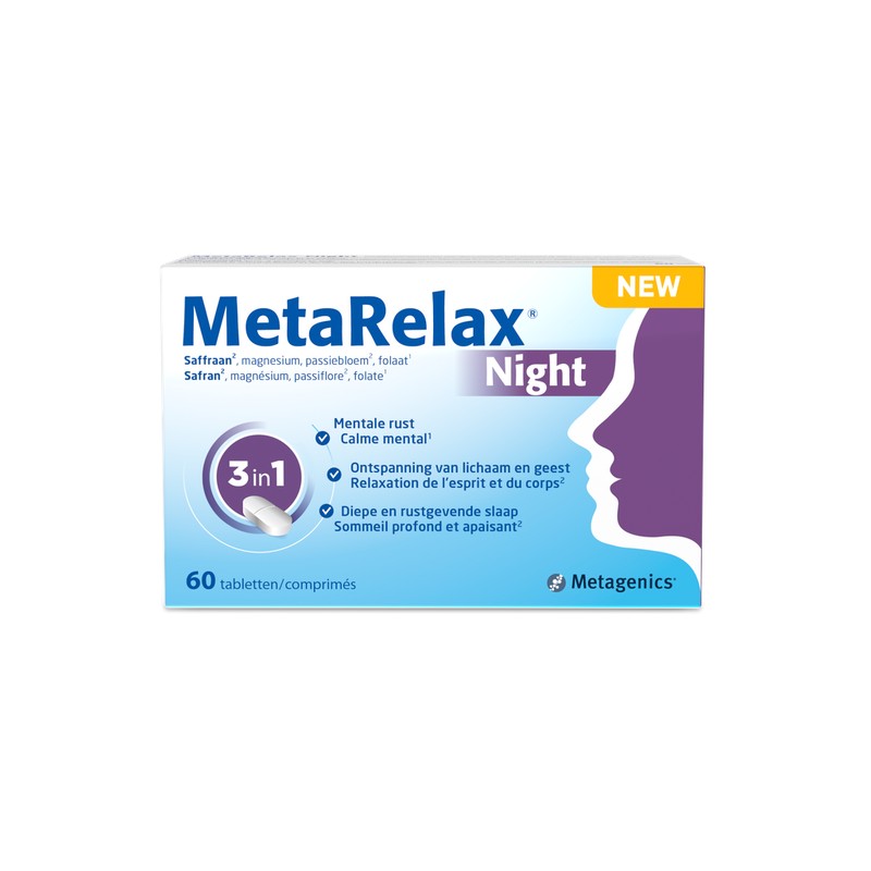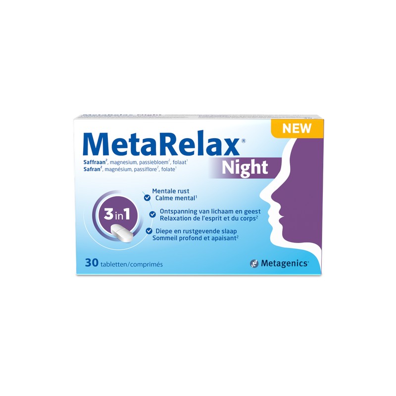 Metagenics MetaRelax Nacht Tabletten bevat een zorgvuldig samengestelde combinatie van nutriënten en plantenextracten. Deze unieke formule combineert onder andere saffraan, magnesium, passiebloem en folaat in één tablet.