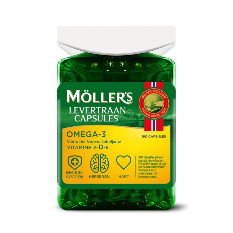 Möller’s Omega-3 Levertraancapsules van wilde Noorse kabeljauw: pure levertraan in gemakkelijke capsulevorm. Een unieke combinatie van natuurlijke omega-3 én vitamine A, D en E.