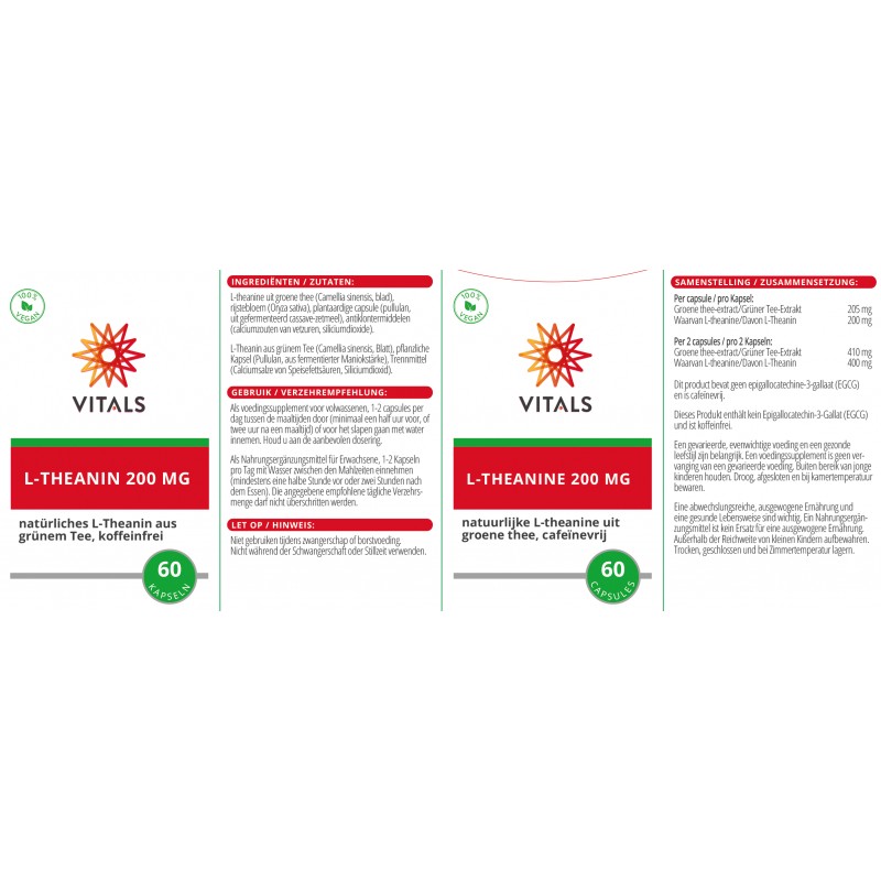 L-theanine uit groene thee (Camellia sinensis, blad), rijstebloem (Oryza sativa), plantaardige capsule (pullulan, uit gefermenteerd cassave-zetmeel), antiklontermiddelen (calciumzouten van vetzuren, siliciumdioxide).
