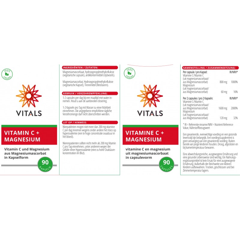 | Vitamine C (uit magnesiumascorbaat) | 800 mg | 1000% |