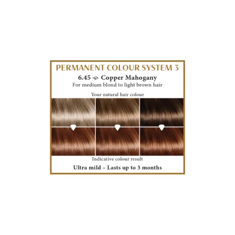 Geeft een stralende en langdurige koper mahonie kleur aan middenblond tot lichtbruin haar.