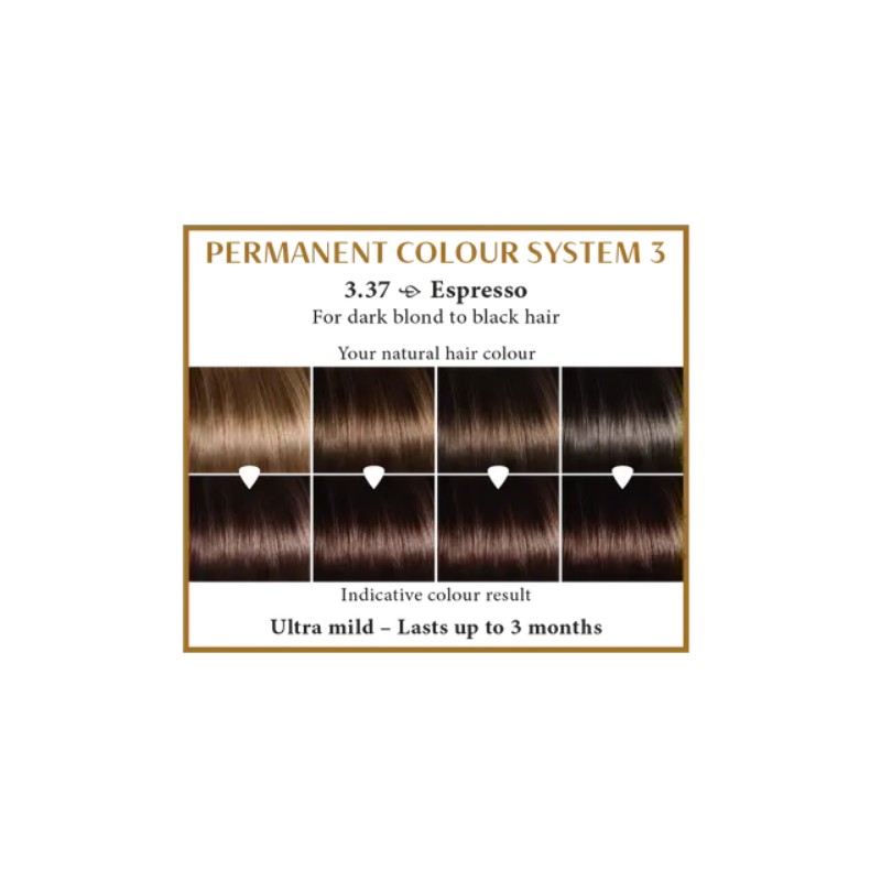 INGREDIENTS LONG LASTING COLOUR ESPRESSO 3.37: AQUA (WATER), COCAMIDE MEA, CETEARETH-6, POLYSORBATE 80, AMMONIUM HYDROXIDE, TOLUENE-2,5-DIAMINE SULFATE, CETEARYL ALCOHOL, PARFUM (FRAGRANCE), SODIUM SULFITE, RESORCINOL, GLYCERIN, 2-METHYLRESORCINOL, ASCORBIC ACID, PROPYLENE GLYCOL, TRISODIUM HEDTA, DIMETHYLPABAMIDOPROPYL LAURDIMONIUM TOSYLATE, 5-AMINO-6-CHLORO-O-CRESOL, M-AMINOPHENOL, HELIANTHUS ANNUUS (SUNFLOWER) SEED EXTRACT*, ASPALATHUS LINEARIS LEAF EXTRACT*, CAMELLIA SINENSIS LEAF EXTRACT*, CASSIA ANGUSTIFOLIA LEAF EXTRACT*, CHAMOMILLA RECUTITA (MATRICARIA) FLOWER EXTRACT*, HUMULUS LUPULUS (HOPS) EXTRACT*, MELISSA OFFICINALIS LEAF EXTRACT*, PANAX GINSENG ROOT EXTRACT*, ROSMARINUS OFFICINALIS (ROSEMARY) LEAF EXTRACT*.