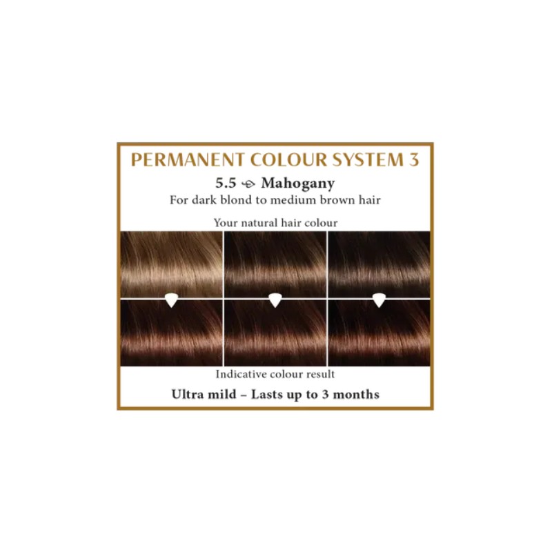 INGREDIENTS LONG LASTING COLOUR MAHOGANY 5.5: AQUA (WATER), COCAMIDE MEA, POLYSORBATE 80, CETEARETH-6, AMMONIUM HYDROXIDE, CETEARYL ALCOHOL, PARFUM (FRAGRANCE), TOLUENE-2,5DIAMINE SULFATE, SODIUM SULFITE, 4-AMINO-M-CRESOL, GLYCERIN, 2-METHYLRESORCINOL, ASCORBIC ACID, 1-NAPHTOL, PROPYLENE GLYCOL, TRISODIUM HEDTA, 2-AMINO-6-CHLORO-4-NITROPHENOL, 4-AMINO-2-HYDROXYTOLUENE, RESORCINOL, DIMETHYLPABAMIDOPROPYL LAURDIMONIUM TOSYLATE, HELIANTHUS ANNUUS (SUNFLOWER) SEED EXTRACT*, CHAMOMILLA RECUTITA (MATRICARIA FLOWER) EXTRACT*, CAMELLIA SINENSIS (LEAF) EXTRACT*, MELISSA OFFICINALIS (LEAF) EXTRACT*, HUMULUS LUPULUS (HOPS FLOWER) EXTRACT*, ASPALATHUS LINEARIS LEAF EXTRACT*, PANAX GINSENG (ROOT) EXTRACT*, CASSIA ANGUSTIFOLIA (LEAF) EXTRACT*, ROSMARINUS OFFICINALIS (ROSEMARY LEAF) EXTRACT*.