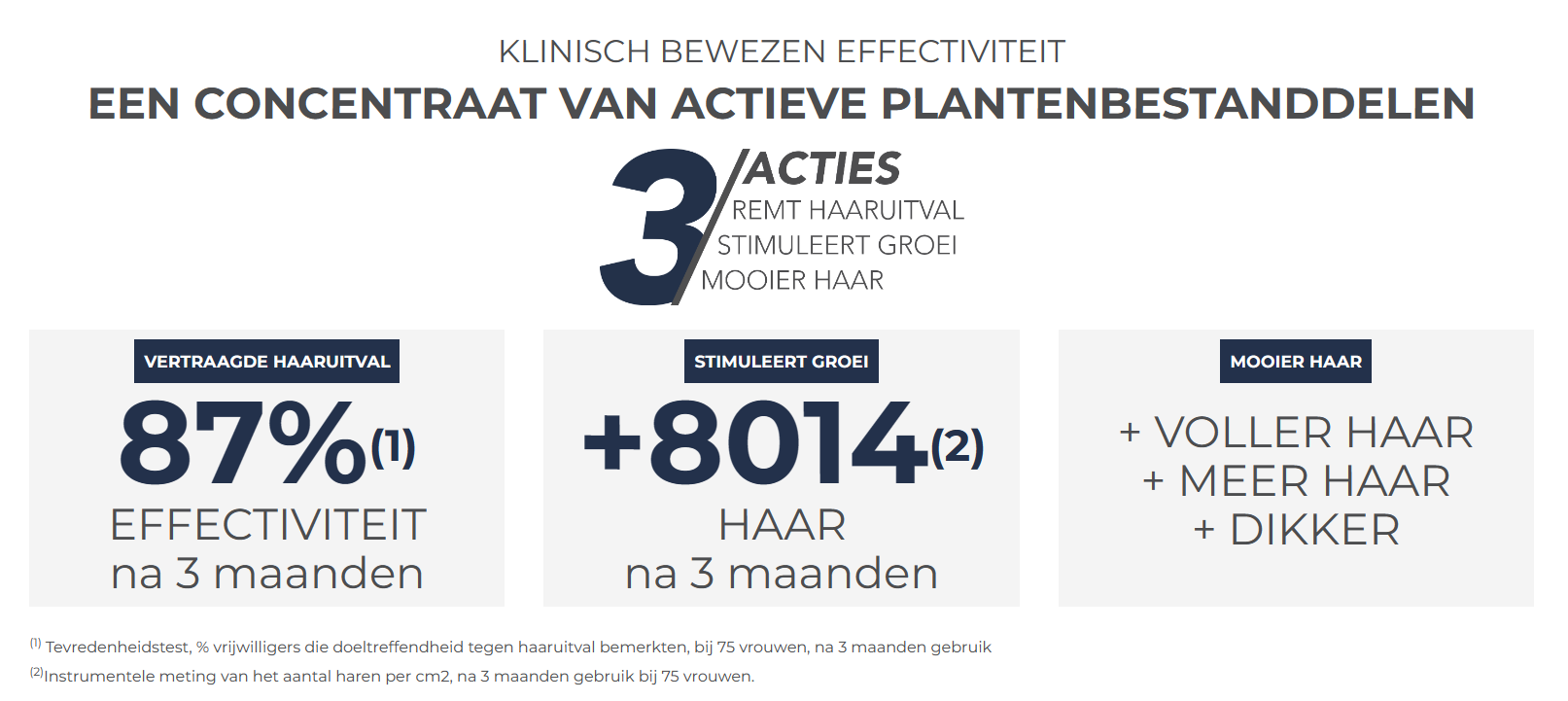(2)Instrumentele meting van het aantal haren per cm² na gebruik gedurende 3 maanden bij 76 vrouwen. (3)% algemene tevredenheid over het product na gebruik gedurende 3 maanden bij 76 vrouwen.
