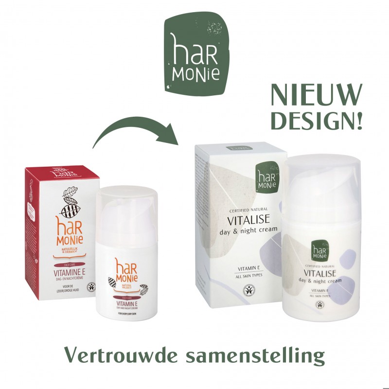 Harmonie Vitalise dag- en nachtcrème. Deze gecertificeerd natuurlijke Vitalise dag- en nachtcrème, verrijkt met Vitamine E, biologische Macadamia olie, Sheabutter, Kokosolie, Avocado olie en Aloë vera extract, voedt, beschermt en verzorgt de droge huid op natuurlijke wijze. Helpt vroegtijdige huidveroudering voorkomen, gaat rimpelvorming tegen en biedt een optimale verzorging van littekens. Voor een zachte, gladde huid, veerkracht en vitaliteit. Ook geschikt voor de gevoelige huid.