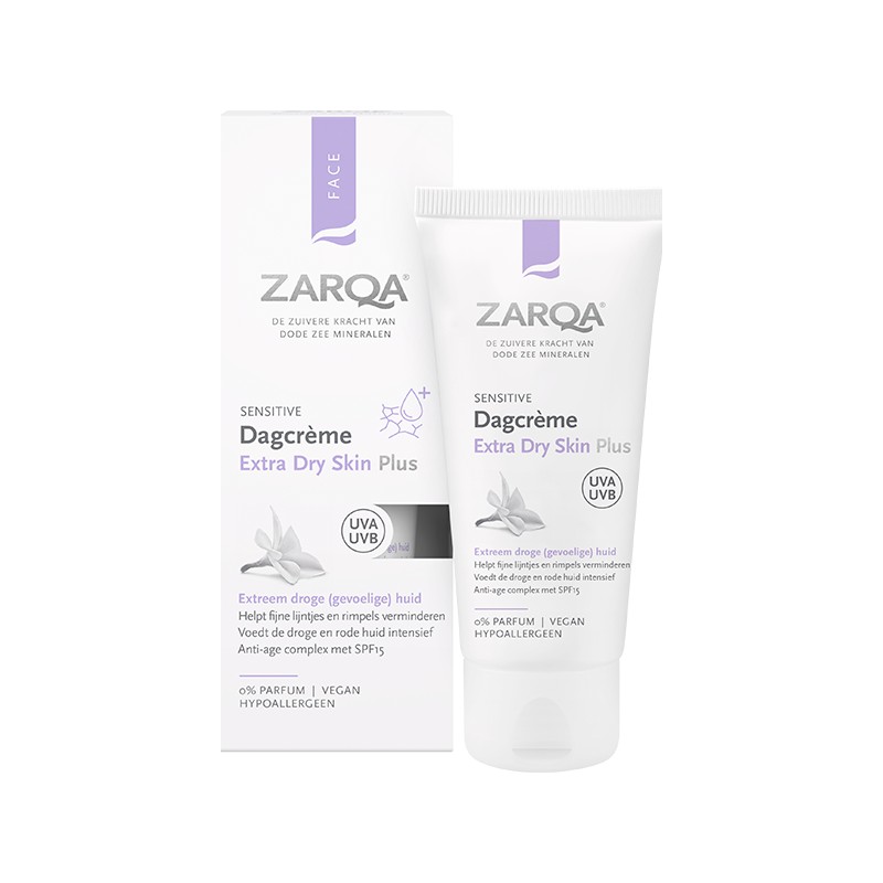ZARQA Dagcrème Extra Dry Skin Plus – met anti-age complex en SPF15 – is een rijk hydraterende dagcrème op oliebasis, die de extreem droge (gevoelige) huid intensief beschermt, voedt en verzorgt.