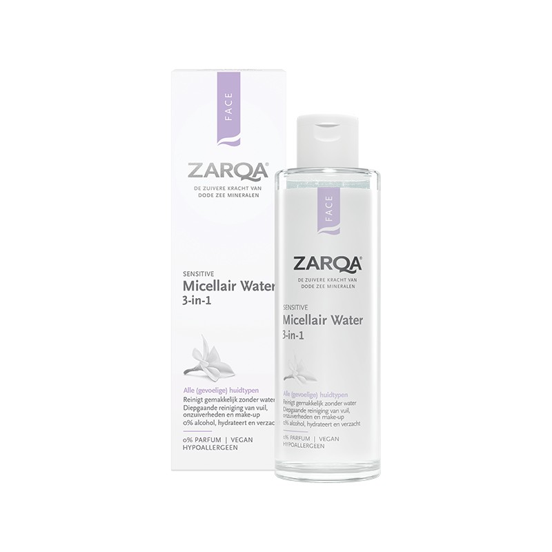 ZARQA Micellair water – met Dode Zee mineralen en aloë vera – heeft een 3-in-1 werking: het reinigt de huid, verwijdert make-up en onzuiverheden en helpt met het herstellen en kalmeren van de huid. Micellen zijn microscopisch kleine deeltjes die als een magneet vuil, make-up en overtollig talg omsluiten; het gebruik van water, hard wrijven en afspoelen is hierdoor niet nodig. Aloë Vera en provitamine B5 kalmeren de huid en helpen de vochtbalans herstellen. Bevat geen parfum, alcohol of andere irriterende stoffen en is zo mild dat het zelfs kan worden gebruikt op de gevoelige huid rondom de lippen en ogen. De huid voelt na gebruik gehydrateerd, schoon en niet trekkerig aan.